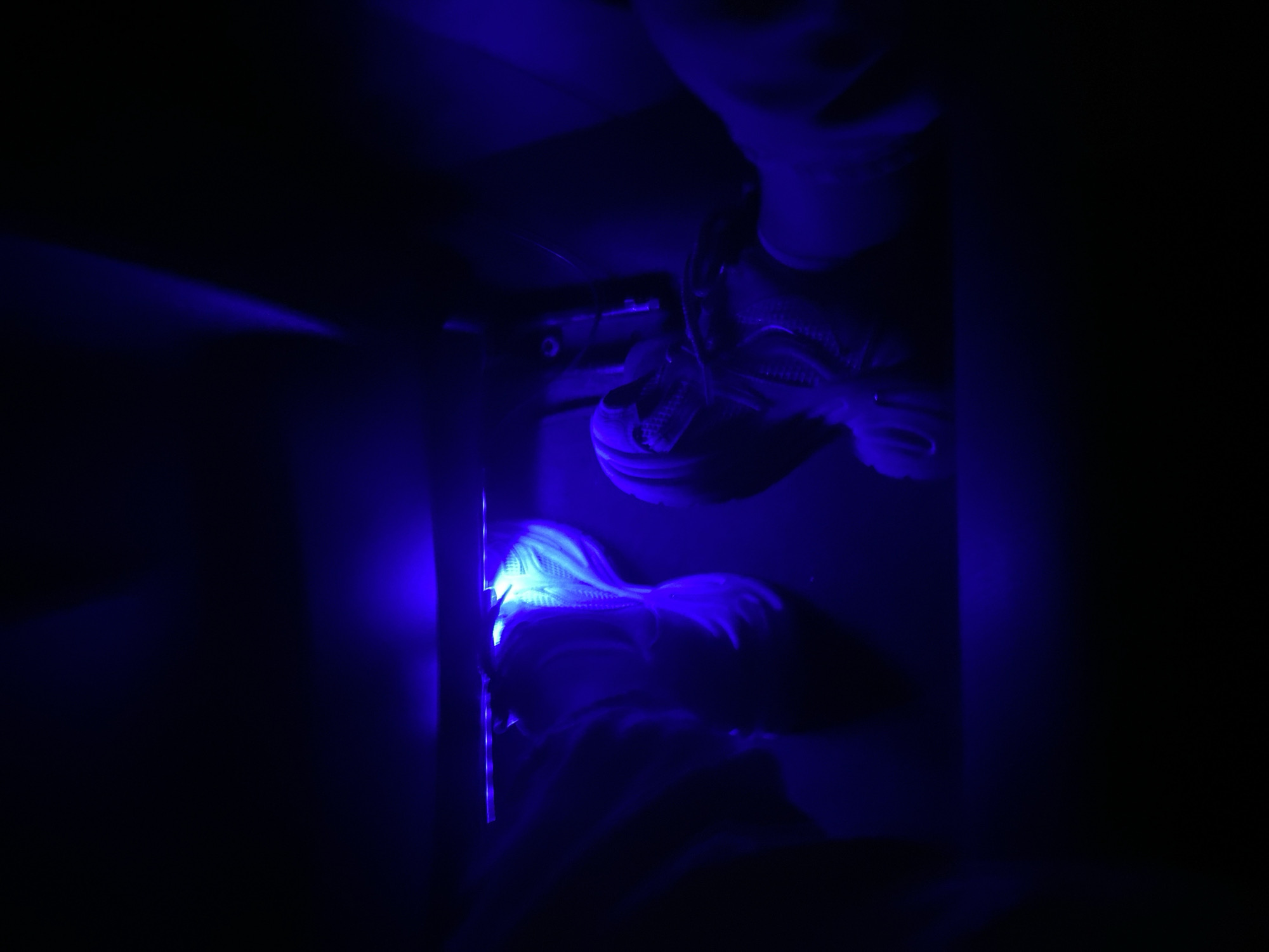 A scene in extreme low light, tinted entirely in blue, depicts two people, one standing and one lying down. A sneaker is visible on the feet of the standing individual. The prone person has hair illuminated, suggesting the illumination source is closer to them. Other details are obscured by darkness. There is no discernible information to determine a location in Blagoevgrad, Bulgaria.