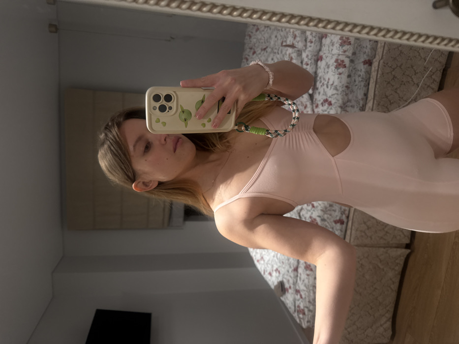 A woman in a pink, sleeveless bodysuit takes a mirror selfie with her iPhone