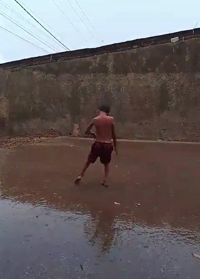 A young boy is dancing in a puddle on what appears to be a paved street. He is wearing red and black patterned shorts and is shirtless. The street is wet, and there are some leaves scattered around. Behind the boy is a textured, greyish wall. Above, power lines stretch across the sky, which is overcast. In the background to the left is a partially visible structure. The video is shot in daylight.