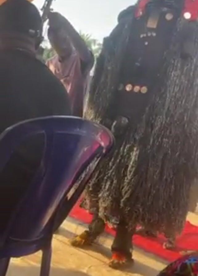 A man in a black, shaggy costume with silver embellishments stands on a red rug outdoors. He is facing away from the camera, and part of a blue plastic chair is in the foreground. To the left, another man in a black shirt is sitting. Behind the costumed man, a person in a pink shirt is holding a microphone stand. The scene appears to be under some sort of tent or awning. The light is bright.