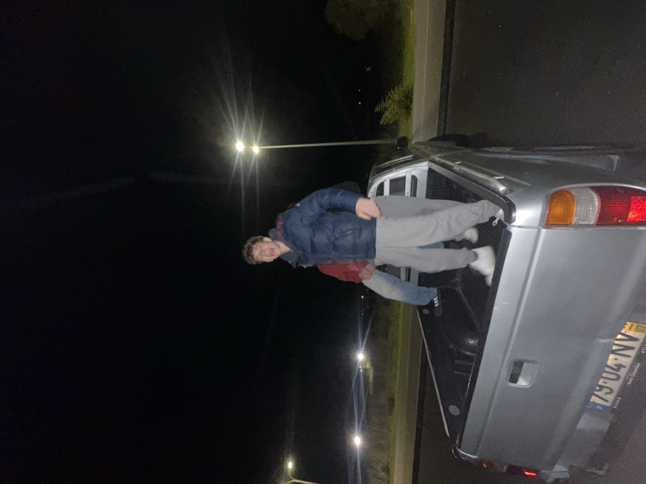 At night in Mirandela, Portugal, two young males are positioned within the bed of a silver pickup truck