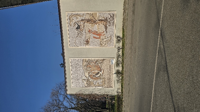 An outdoor scene in Stara Zagora, Bulgaria, displays a light-colored building wall facing a paved road under a clear blue sky. Two large, rectangular mosaic murals are affixed to the wall. The left mural features an abstract or symbolic scene with a prominent circular element, set against a background depicting a settlement, with Cyrillic text at its base. The right mural portrays a reddish-brown fox standing on its hind legs next to a leafless tree, with a bird perched in its branches and Cyrillic text below. In the foreground, an asphalt road runs horizontally, marked by a single white painted line. Shadows from an unseen overhead structure or object stretch across the road and the base of the wall. A narrow strip of low green bushes separates the road from the wall. To the left of the wall, a park area is visible with numerous bare deciduous trees and green grass, suggesting a late autumn or winter season. No individuals are present, and no actions or interactions are occurring. The lighting indicates a sunny day. A dark, angular structure is partially visible in the upper right corner, likely part of an architectural feature or overpass.