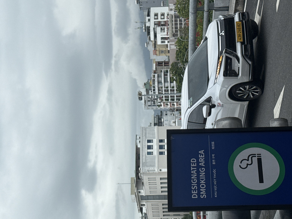 An outdoor scene captured under a cloudy, overcast sky depicts an urban environment in Hòa Cường Ward, Da Nang, Vietnam. In the foreground, a dark blue rectangular sign, partially cropped on the left, displays "DESIGNATED SMOKING AREA" in English, Vietnamese ("KHU VỰC HÚT THUỐC"), Korean, and Chinese/Japanese scripts. Below the text, a white circular icon with a green border features a stylized lit cigarette emitting smoke. In the midground, a white Mitsubishi Xpander minivan is positioned on a paved road, facing slightly left. The vehicle's front grille features the Mitsubishi emblem, and its license plate reads "43H-240.82." A red "TP" logo is visible on the front passenger door. A gray metal barrier separates the sign from the road and continues horizontally across the frame. Sparse red foliage is visible behind the barrier to the right of the sign. The background reveals a dense urban skyline composed of various multi-story buildings, predominantly in shades of white, beige, and gray. Some buildings feature visible windows, balconies, and rooftop antennae or structures. Green trees are interspersed throughout the urban landscape. Distant, hazy mountains or hills are visible beneath the low, gray clouds on the horizon. No individuals are present in the image.