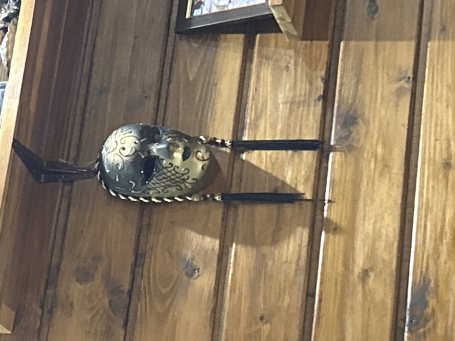 An ornate, dark-colored mask with gold accents hangs against a light brown, horizontally paneled wooden wall in Bukovlak, Bulgaria