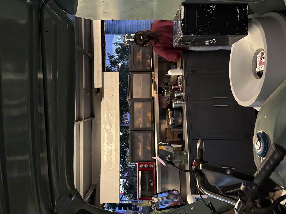 A person in a red shirt stands behind a counter. Display cases filled with goods line the wall beside them. Above the counter are shelves holding various kitchen items. Below the counter are dark cabinets. A motorcycle with a sidecar partially obscures the view, its handlebars and mirrors prominently displayed. The background suggests an urban outdoor setting.