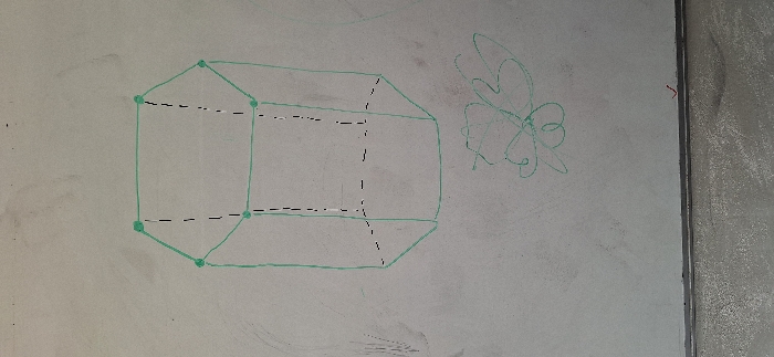 The scene depicts a white surface, likely a whiteboard, with green marker drawings. Dominating the upper portion is a two-dimensional representation of a hexagonal prism, rendered with solid green lines for visible edges and dashed green lines for hidden edges. Six small green dots mark the vertices of the top hexagonal face, and six more dots are implied for the base, with three explicitly marked at visible corners. Below this geometric drawing, in the lower-middle section, is a smaller, abstract green marker scribble resembling a stylized bow or a collection of loops. The white surface exhibits minor smudges and faint gray markings. A dark gray horizontal line runs across the bottom of the image, appearing to be the lower edge or frame of the whiteboard. A small, faint red checkmark is visible on this gray line towards the bottom right. The depicted location is a facility within the city of Pernik, Bulgaria. No individuals or active interactions are visible.