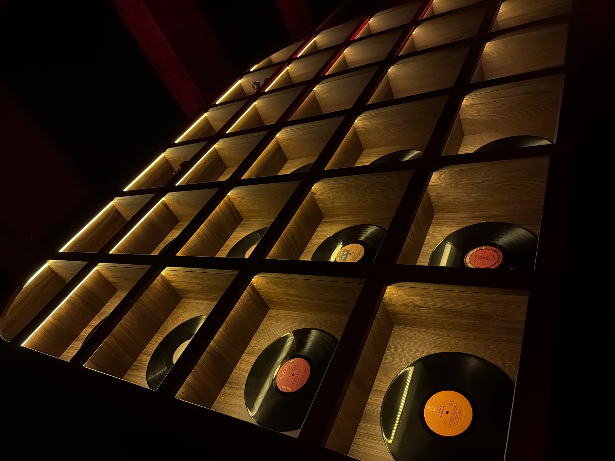 wall display of vinyl records within individual wooden cubicles, illuminated with golden lighting