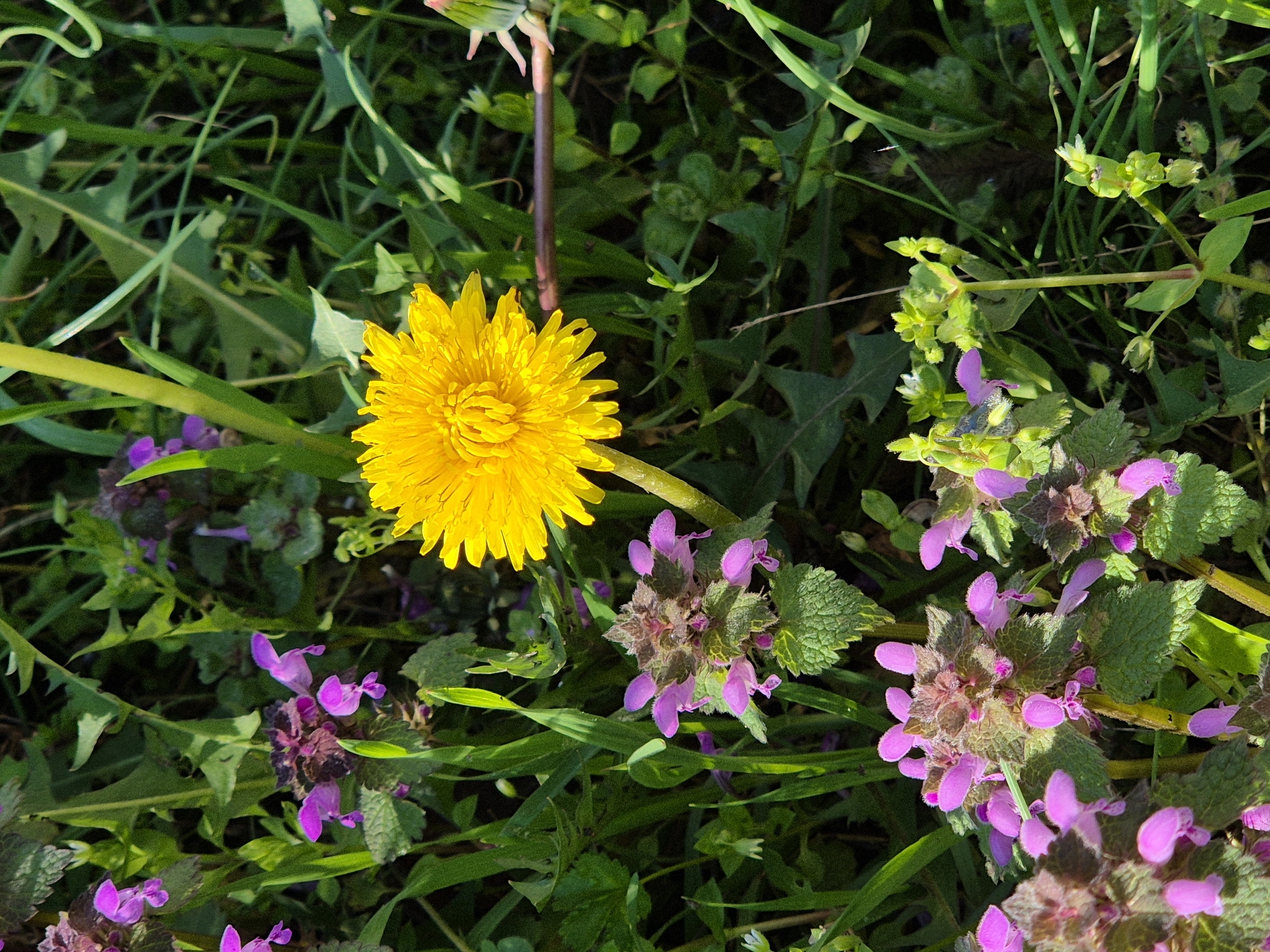 The image depicts a close-up view of wildflowers in a grassy area. A bright yellow dandelion is prominently featured in the center-left of the frame. To the right and below the dandelion are clusters of purple dead-nettle flowers. Green grass and various other green plants fill the background. The image does not contain any people, actions, or interactions. The information provided is insufficient to determine if the image was taken in the city of Tutrakan, Bulgaria.