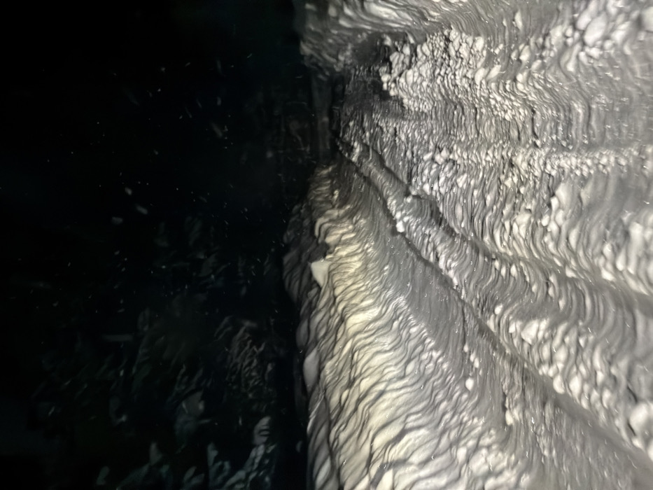 The image displays a snow-covered road or track at night in Dubovaya, Russia. The path is bordered by substantial snow banks exhibiting corrugated textures, particularly evident on the left where they are illuminated by an off-frame light source, presumably vehicle headlights. These headlights also cast long, parallel shadows across the snow banks and within the two distinct tire tracks running down the center of the path. The background is characterized by deep darkness, with faint, indistinct outlines of what appear to be snow-laden trees or dense vegetation. Numerous small, bright particulate specks are visible against the dark upper background, consistent with falling snow illuminated by the light source. There are no individuals, explicit actions, or direct interactions depicted within the scene.