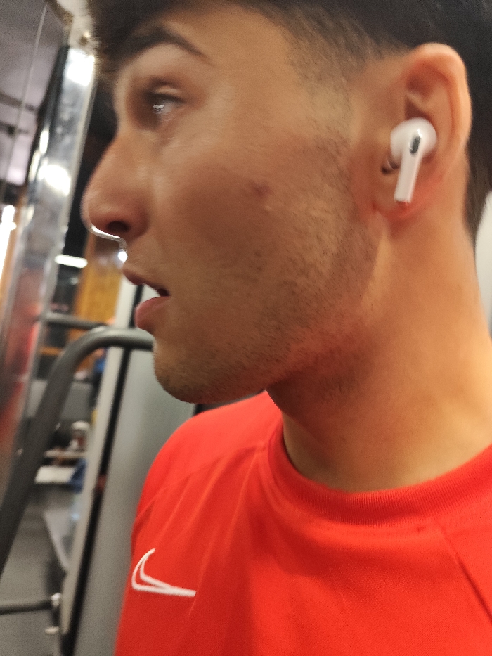 This scene is depicted as being located in Joubar Municipality, Syria. The image focuses on the right profile of a young adult male with light skin and short, dark hair. He has stubble visible on his jawline and a faint blemish on his right cheek. A silver nose ring is present in his left nostril. A white wireless earbud is inserted into his right ear. He is wearing a red athletic shirt with a white Nike 'swoosh' logo visible on the left chest/shoulder area. His mouth is slightly open, and his gaze is directed upwards and to the left of the frame. The background is out of focus, showing metallic and dark structures consistent with gym equipment in an indoor setting.