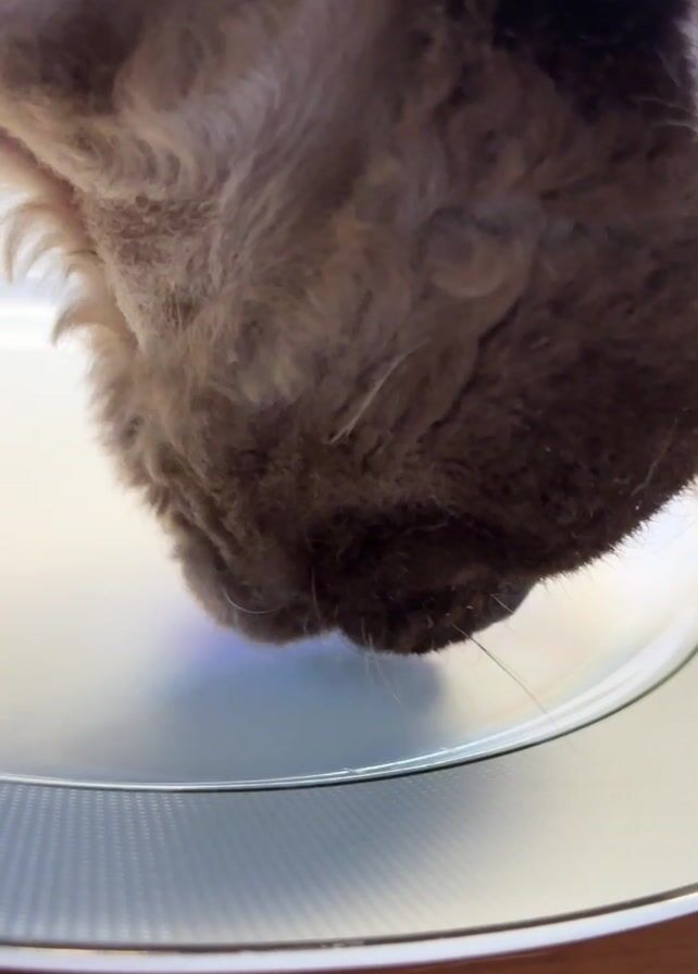 - "A close-up shot shows a dog lapping something from a white plate with a silver rim" by FM-8DndN2, licensed under CC BY 4.0
