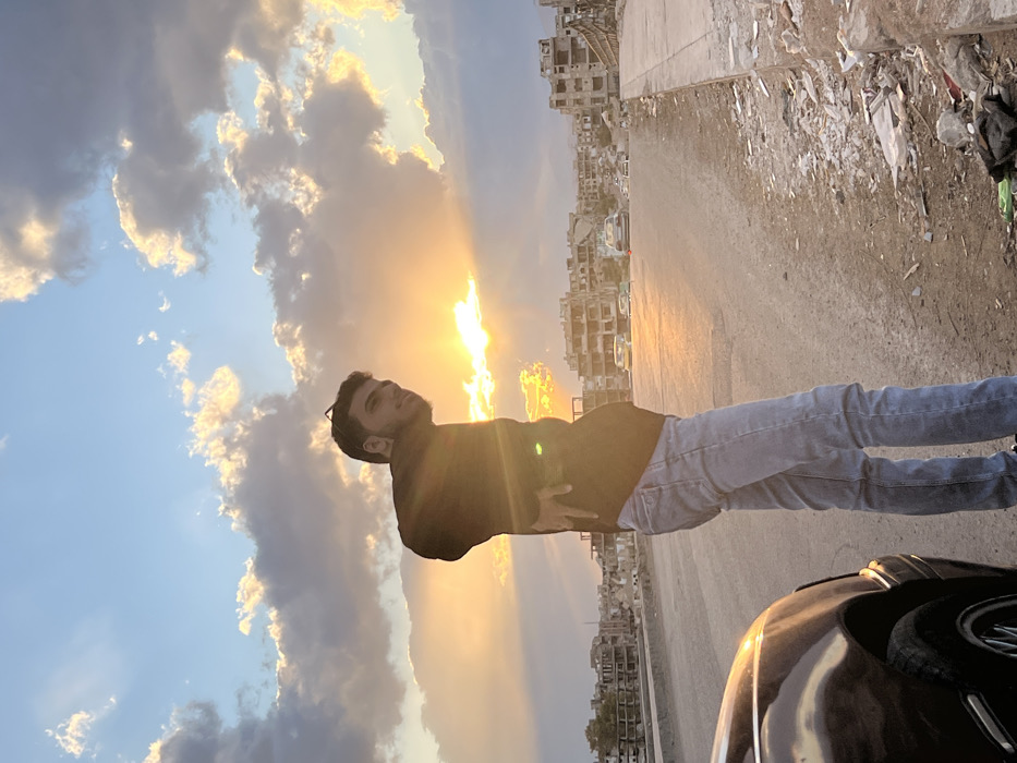 The scene depicts a male individual standing outdoors during what appears to be sunset, with the sun low on the horizon and partially obscured by clouds, casting an orange and yellow glow across the sky. The location is an urban environment in Zamalka, Syria, characterized by a visible road or overpass and numerous multi-story buildings in the background, many appearing damaged or dilapidated with exposed structural elements. The subject is a young adult male, positioned facing right and slightly away from the camera, with his head turned towards the right side of the frame. He has dark hair and a beard/stubble, with sunglasses perched on top of his head. He is wearing a dark, long-sleeved top and light-colored jeans. His left hand is placed on his hip or lower back. In the immediate foreground on the left, the front portion of a dark-colored vehicle, including part of its hood and wheel, is visible. The road surface appears to be asphalt, with a concrete barrier or sidewalk running along the right edge, where scattered debris and waste are present. In the mid-distance along the road, several vehicles are visible. Further in the background, beyond the damaged buildings, outlines of hills or mountains are faintly discernible.