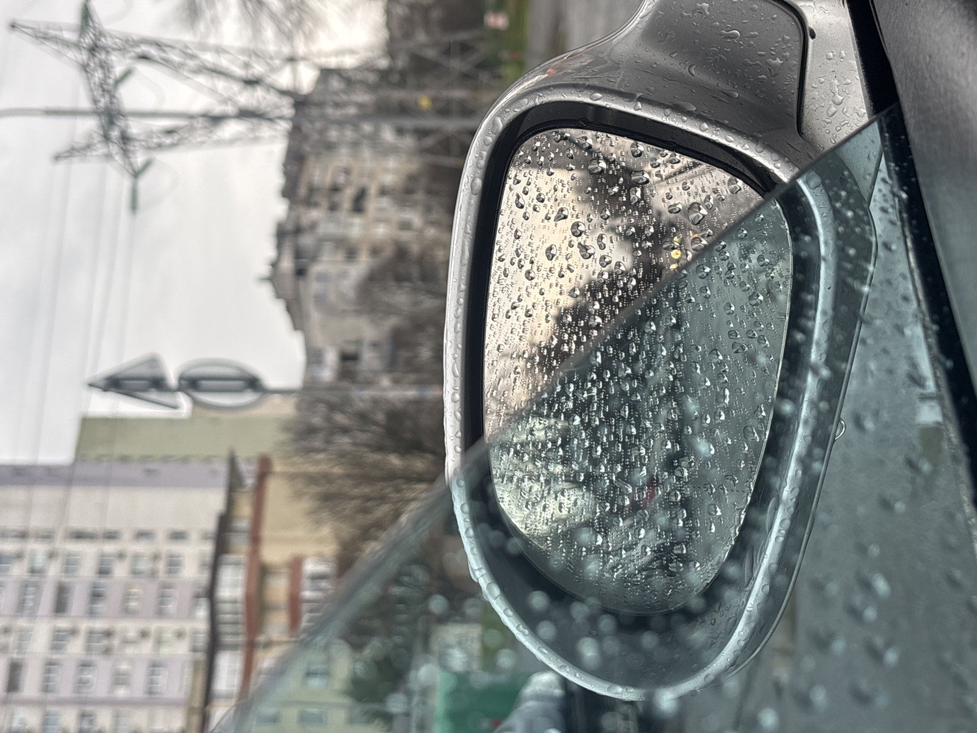 side mirror of a car on a rainy day, with raindrops obscuring the view
