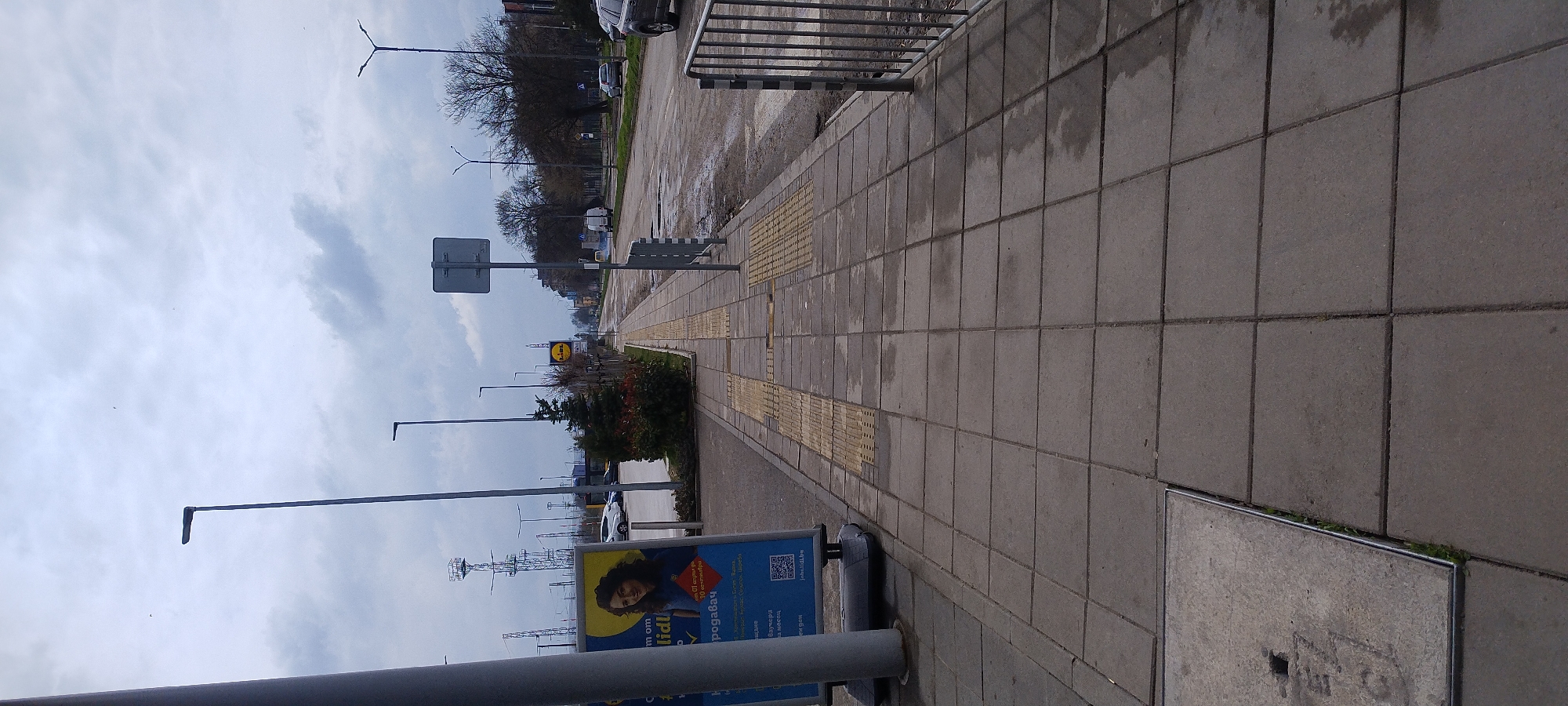 The image depicts an urban street scene in Lom, Bulgaria, under an overcast sky. The viewpoint is from a paved sidewalk, looking down a multi-lane asphalt road. In the foreground, a large, grey utility pole stands on the far left. Adjacent to it, a blue-and-yellow advertising billboard for "Lidl" is visible, featuring a smiling woman with dark curly hair and text primarily in Bulgarian, including a QR code and the "Lidl.bg" URL. The sidewalk consists of grey square paving slabs, with a prominent strip of yellow tactile paving running along its length. Water puddles or wet patches are visible on the paving. A concrete manhole cover with a metal frame is partially visible in the bottom-left corner. The midground features the continuation of the sidewalk and tactile paving. To the right, a grey metal barrier and the back of a square road sign on a pole separate the sidewalk from the street. The asphalt road surface exhibits numerous wet patches and appears uneven. Along the left side of the road, a row of low evergreen bushes and small trees fronts a parking area where several cars are visible. Further down the road, a yellow "Lidl" logo sign is visible on the horizon. On the right side of the road, a silver SUV is partially parked, and further down, a white van and other vehicles are present. Numerous tall, grey streetlights with rectangular heads are spaced along the road and sidewalk. In the distant left background, a tall metal lattice tower is visible. The background consists of an overcast sky with light grey clouds. No individuals are visible in the scene. The overall environment suggests a damp, possibly post-rain, urban setting.