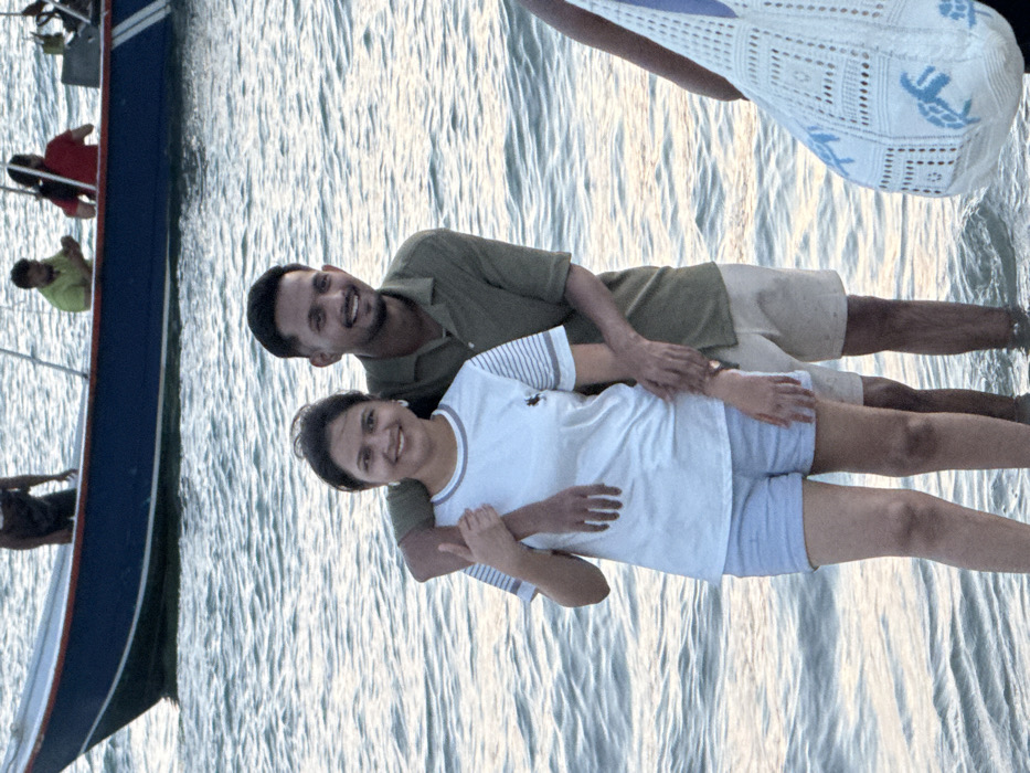 The image depicts a scene at Cenang Beach, Langkawi, Malaysia, featuring individuals in shallow water with a boat in the background. In the foreground, a man and a woman stand in knee-deep, rippled water, both smiling and looking forward. The woman, positioned on the left, wears a white short-sleeved t-shirt with grey striped details on the sleeves and collar, paired with light blue shorts. Her right hand rests on the man's left arm. The man, positioned behind and slightly to the right of the woman, wears an olive green short-sleeved collared shirt and light-colored shorts. His right arm is around the woman's upper back, and his left hand is placed near her waist. To the far right, a partially visible individual holds a white crocheted bag adorned with light blue turtle designs. In the mid-ground, a blue and white boat floats on the water. Three individuals are visible within the boat: one person in a dark top standing near the bow, one person in a bright green top seated, and another person in a red top also seated. The ambient lighting suggests a late afternoon or early evening setting.