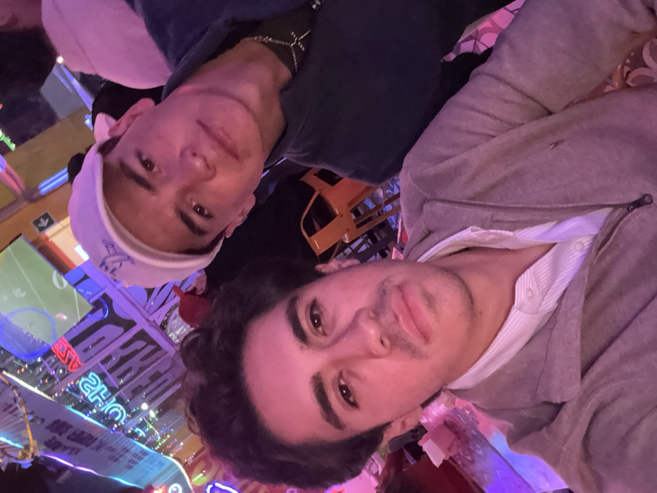 Two young men pose close together in a selfie. The man on the left wears a white cap and a dark shirt with a silver necklace. The man on the right sports a light grey zipped hoodie over a white collared shirt. The lighting is vibrant and somewhat blurred, with neon signs and lights visible in the background, suggesting an indoor entertainment venue. The overall atmosphere appears casual and friendly.