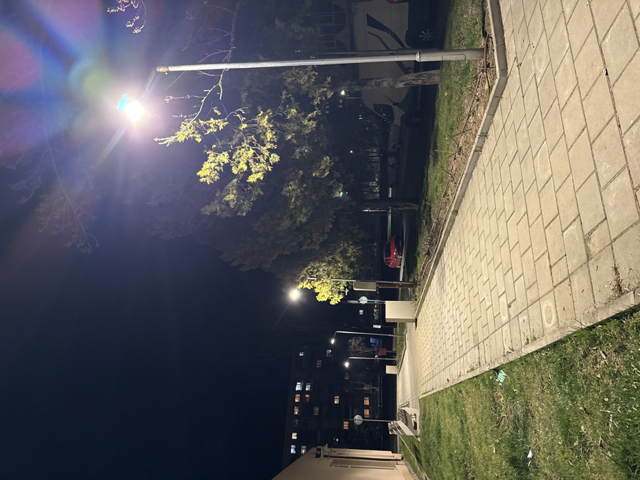 The image depicts an urban street scene at night in Kyustendil, Bulgaria. A straight, paved walkway constructed of light-colored rectangular pavers extends from the lower-left foreground into the mid-distance, illuminated by multiple streetlights. To the left of the walkway, a strip of grass separates it from a light-colored building facade. A wooden slatted bench with metal supports is positioned next to the walkway near this building. To the right of the walkway, a grassy area features several trees, some with visible foliage, others with bare branches. Three distinct streetlights are visible, with the most prominent one on the far right exhibiting significant lens flare. Its bright, cool-toned light illuminates the upper branches of a tree. In the mid-ground, beyond the trees and grass, a dark paved area or street contains a parked red passenger car. Further right, a white utility van with green graphics is also parked. In the background, dark, multi-story residential or institutional buildings are discernible, characterized by numerous illuminated windows across various floors, indicating interior light sources. The sky is dark, consistent with nighttime. No individuals are present in the scene.