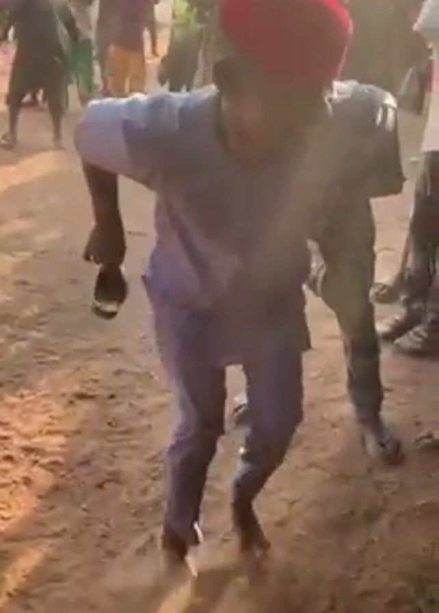 group of people gathered in a sandy, possibly rural area. The central figure is a man wearing a light-colored, long-sleeved outfit, a red cap, and is barefoot. He is holding a pair of sandals in his hands and appears to be dancing or moving energetically. Other people are surrounding him, some are recording the scene with their phones, and others are singing and clapping. The environment appears to be an outdoor space with buildings visible in the background. The lighting suggests it is daytime.