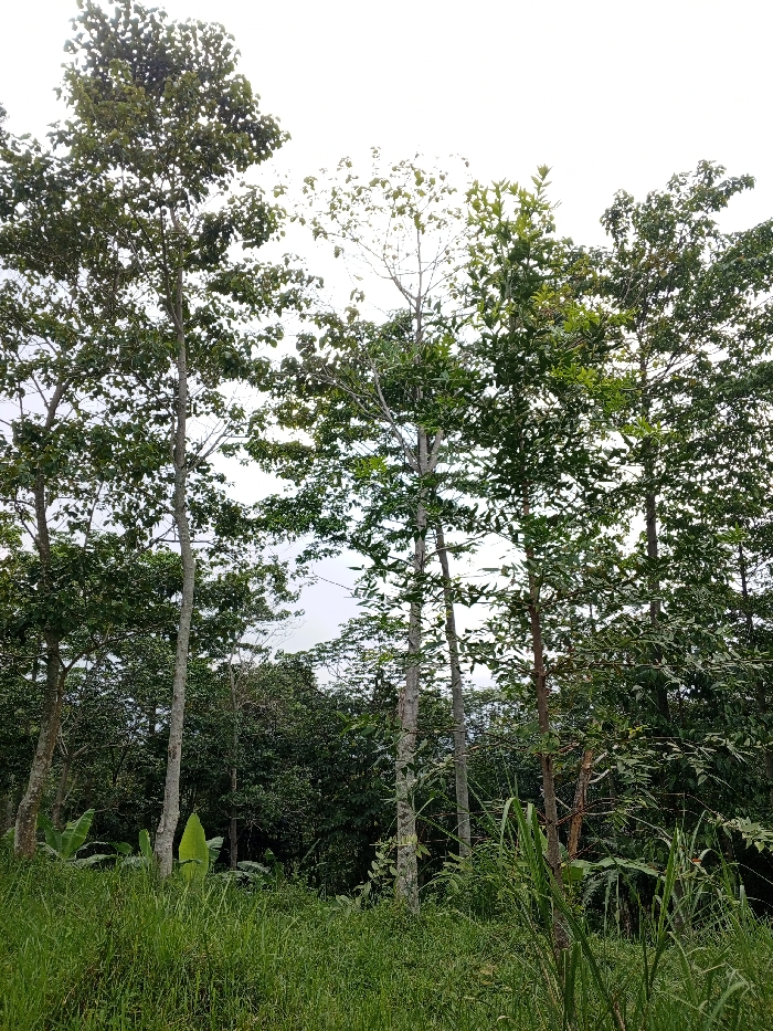 The scene depicts a verdant outdoor environment in Thotagamuwa, Sri Lanka. Multiple tall, slender trees with light-colored, smooth trunks and green foliage dominate the view, extending upwards against an overcast or bright white sky. The tree canopies vary in density and shade of green; one prominent tree near the center exhibits sparser branching and lighter green leaves. The immediate foreground is covered with a dense layer of green grass and assorted undergrowth. Smaller broad-leaved plants, consistent with banana plants, are visible within the vegetation in the lower-left quadrant. No individuals or specific actions are present in the image.