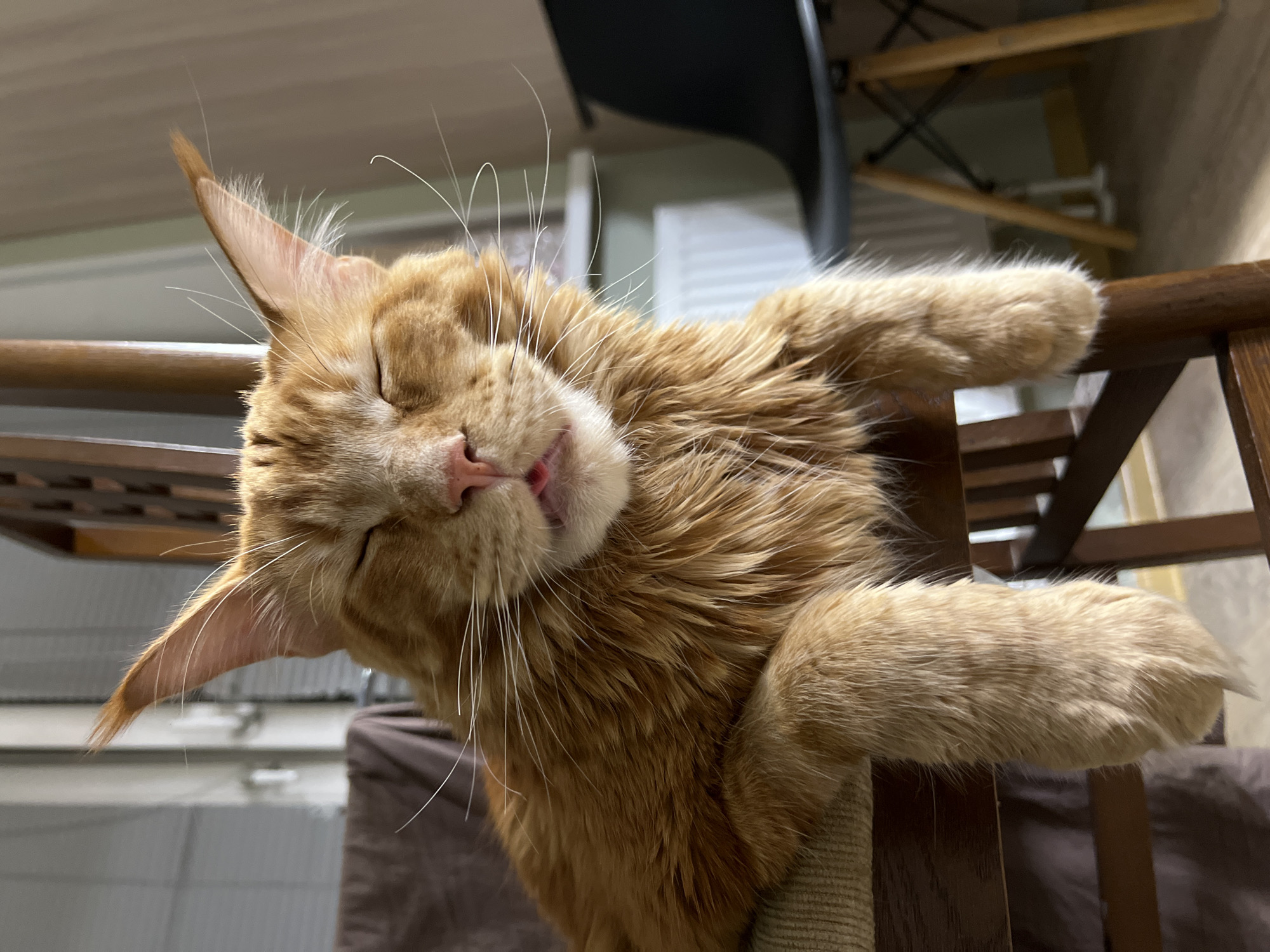 A close-up shot captures an orange tabby cat sleeping. The cat is draped over the wooden rail of a structure, possibly a cat tree or piece of furniture. The cat's eyes are closed, and its tongue is slightly visible. Its fur is thick and ruffled, and long white whiskers extend from its face. The background includes hints of a room interior, with a chair and other furniture visible out of focus. The lighting is warm and diffused, suggesting an indoor setting. There is no indication of the location being Saint Petersburg, Russia.