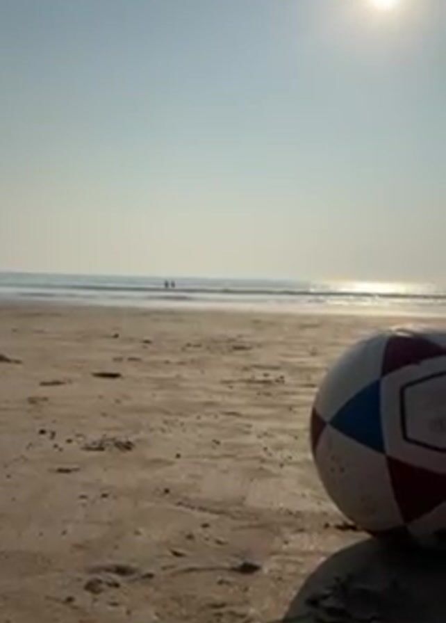 beach on a sunny day. A soccer ball rests in the foreground on the sand. In the distance, two people are in the ocean. The sky is clear and bright. The sun is high in the sky.