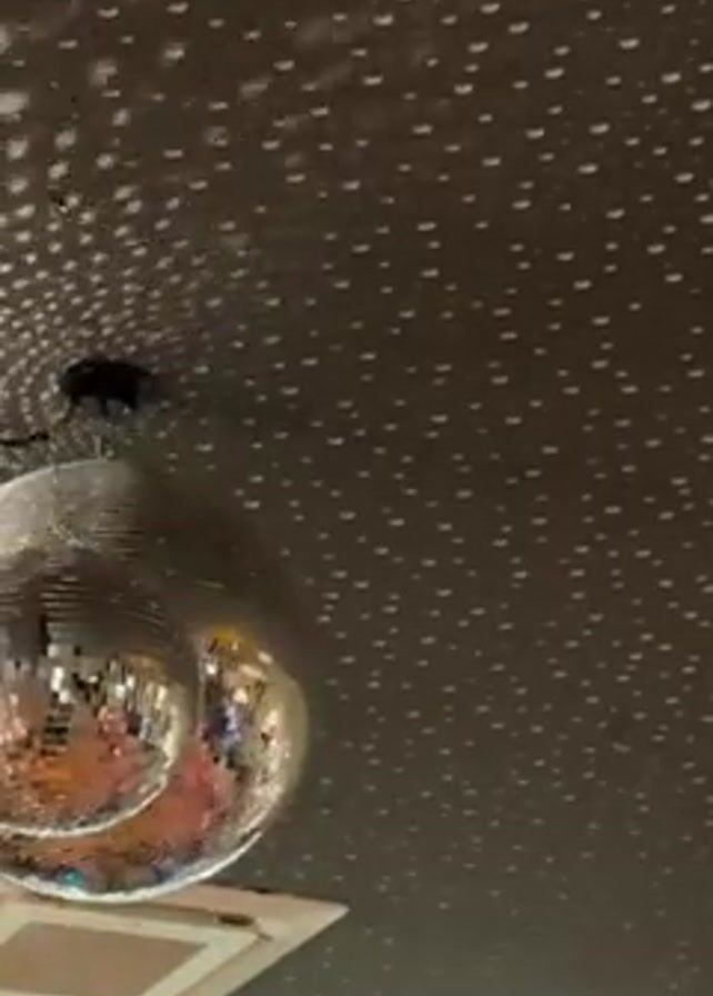The scene shows a disco ball suspended from the ceiling, casting patterns of light onto the dark surface above