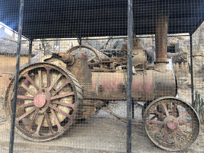 An old, rusty steam tractor sits behind a wire fence. The tractor has large, spoked wheels, a cylindrical boiler, and a tall smokestack. The paint is faded and peeling, revealing rust. Behind the tractor, the background includes rocks and sparse vegetation. The fence casts shadows, obscuring the details of the tractor. The scene evokes a sense of historical preservation and industrial decay.