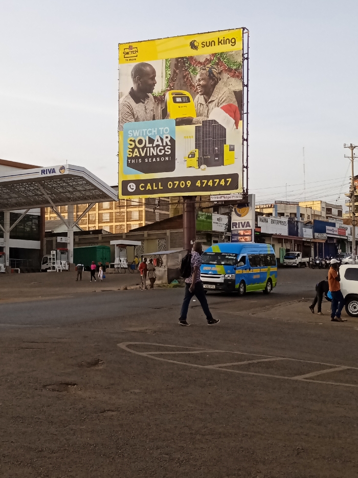 An outdoor scene features a "Sun King" advertisement promoting solar savings with a phone number to call. The ad showcases a man and woman next to solar panels and a generator. In the background, there is a Riva gas station and various buildings. A man is walking across a street with faded markings, and a blue and yellow shuttle bus is also present. The general environment suggests an urban area with some commercial activity.