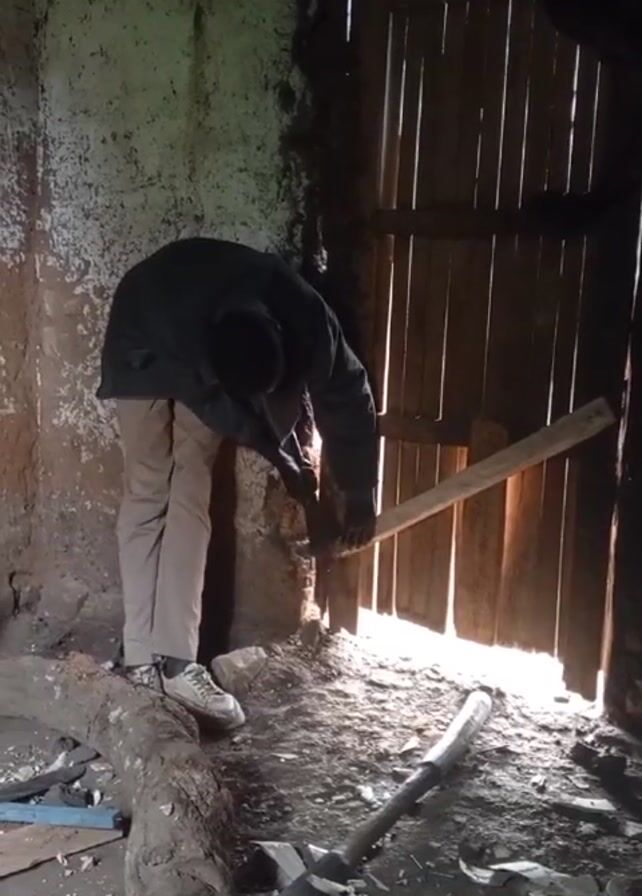Inside a dimly lit, decaying room, a person dressed in a dark jacket and tan pants uses a wooden plank to strike at the wall near a weathered wooden door. The room's interior reveals bare walls, a log lying on the cluttered floor, and debris scattered around. Light shines through the cracks in the door, illuminating the scene. Another person, partially visible, stands near the doorway.