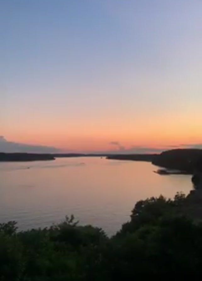 The video depicts a serene sunset over a large body of water, possibly a lake or a wide river. The sky transitions from a light blue at the top to orange and pink hues near the horizon. The water reflects these colors, creating a calm and picturesque scene. There are dark land masses in the distance on both sides of the water. In the foreground, dark green foliage is visible, likely from trees or bushes growing on a high viewpoint. Small boats can be seen in the distance on the water. The overall mood is tranquil and scenic.