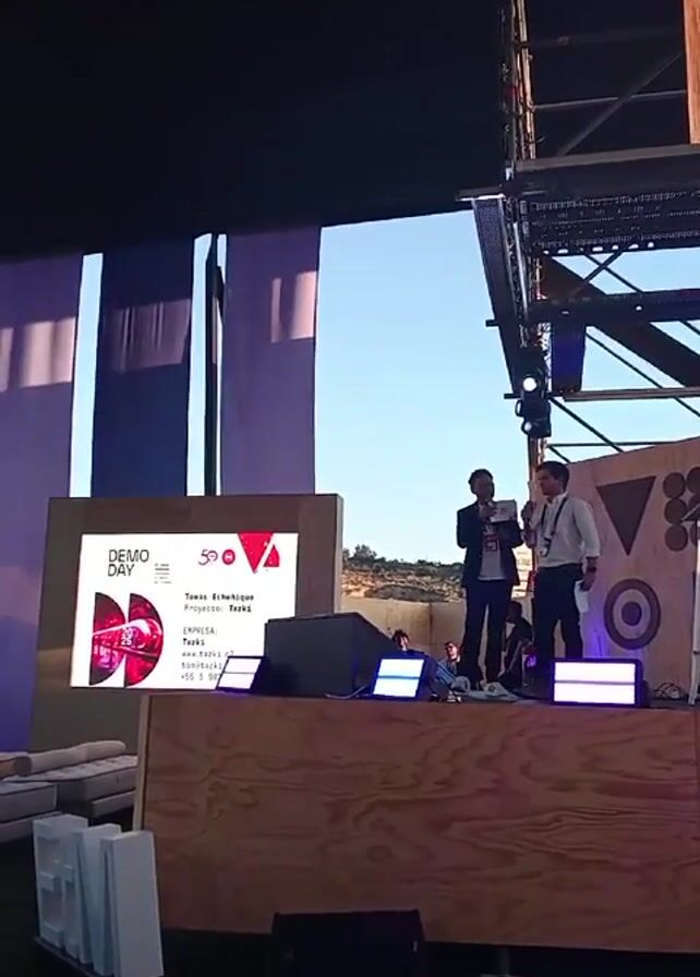 Two men are standing on a stage facing toward the right while talking, one is holding a phone. Behind them is a screen displaying "Demo Day", "50 Startup Chile", "Tomas Echeñique", "Proyecto: Taski", "Empresa: Taski", "Mail: info@taski.cl", and a website and phone number. There are white blocks to the left, speakers in front of the stage, and a geometric wooden panel behind them. Above the stage is black draping and a metal frame. The background shows a hill.