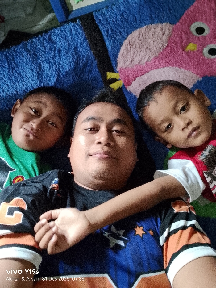 A selfie shows a man lying down with two children. He wears a blue and orange patterned shirt, while the child on the left wears green and the child on the right wears red and white. They are on a blue rug with a pink owl design. A small picture frame is partially visible in the top left corner. The photo includes a timestamp "31 Des 2025, 07:36" and the phone model "vivo Y19s" along the bottom left.
