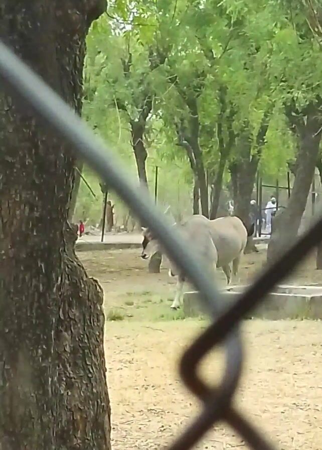 n eland in an enclosure at what appears to be a zoo or wildlife park. The eland is standing near a concrete watering trough on a patch of dry grass. There are trees in the background. The camera is initially focused through a chain-link fence, but then the view shifts to a clear shot of the eland. People can be seen in the distance, beyond the enclosure.