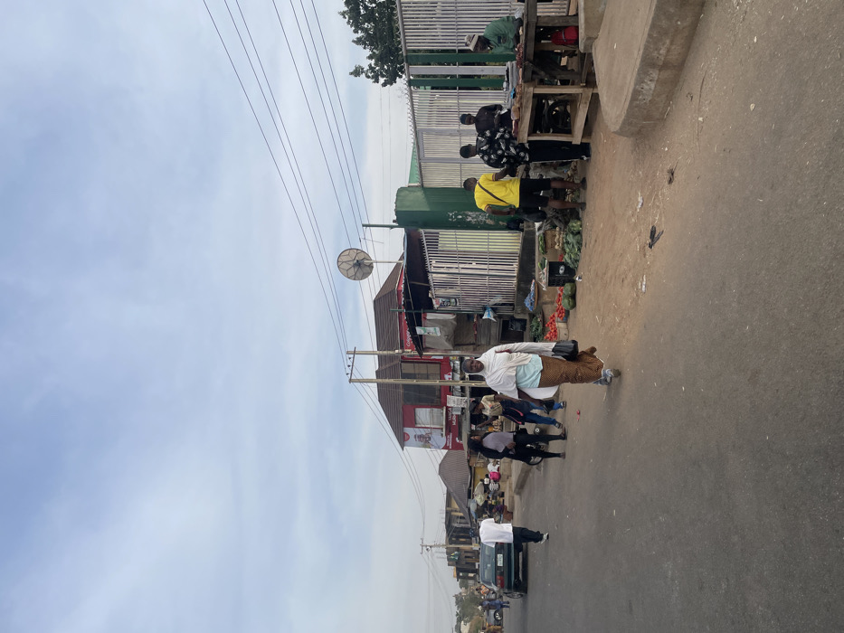 A street scene captures everyday life. Several individuals gather around a roadside stall laden with produce. Others walk along the pavement or cross the road. Overhead, power lines extend across the sky. Buildings line the street, providing a backdrop to the bustling scene. A vehicle is visible further down the road. The image is captured from a slightly elevated perspective.