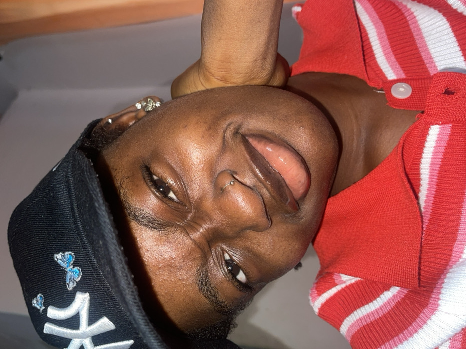 A close-up, eye-level portrait shows an individual with dark skin, short dark hair, wearing a black baseball cap with a white "NY" logo and two small blue butterfly embellishments