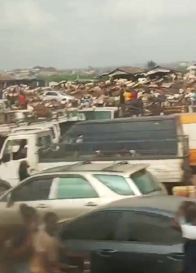 crowded livestock market with numerous sheep and goats