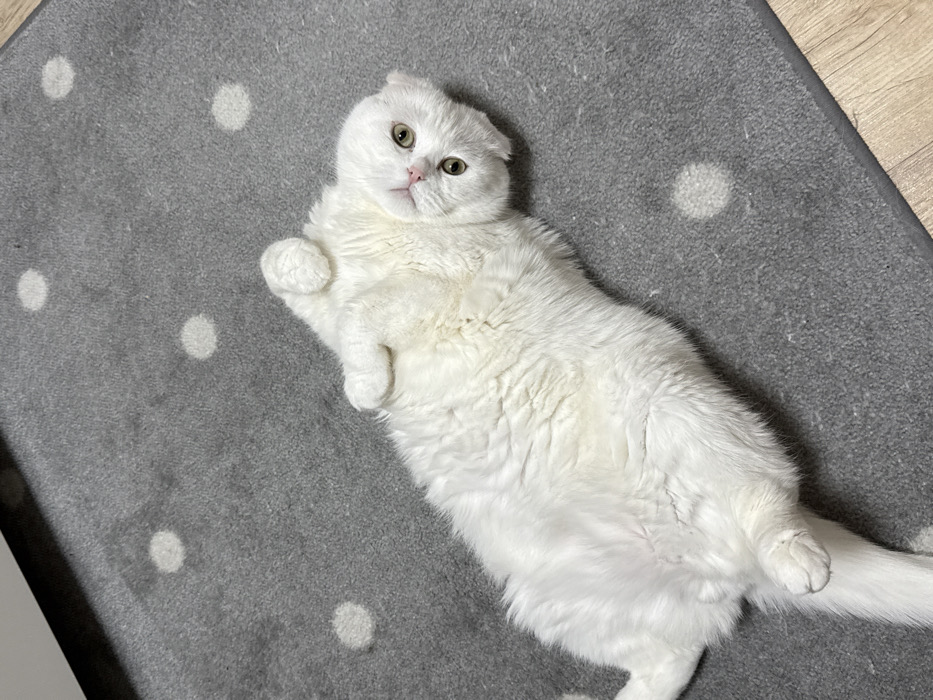 - "A white domestic cat is depicted lying on its back on a gray area rug with a light polka dot pattern" by FM-1FhDq2, licensed under CC BY 4.0
