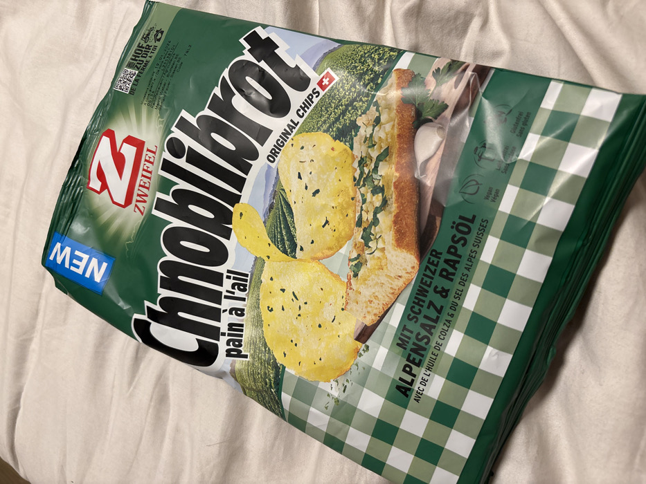 - "A sealed bag of "Zweifel Chnoblibrot Original Chips" is depicted resting on a light beige or off-white textured fabric surface" by FM-hKfOI2, licensed under CC BY 4.0