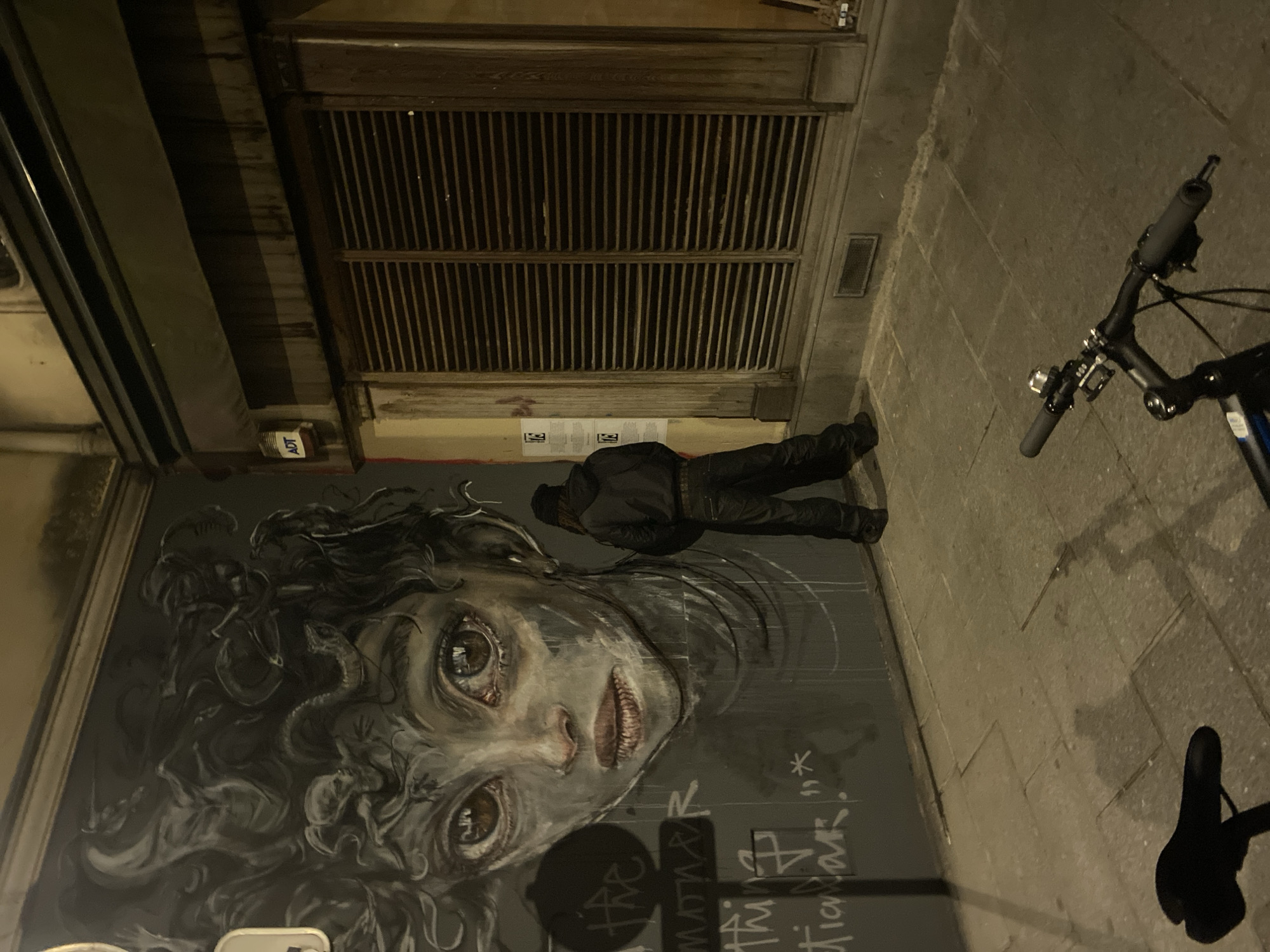 The scene depicts a dimly lit urban corner in Paris, France, at night. On the left wall, a large, detailed mural of a stylized human face with prominent brown eyes and dark, curly hair containing subtle serpentine elements dominates. Below the mural, white graffiti text includes fragments like "the mother" and "tionnar." To the right, a lone individual, dressed in dark clothing including a hooded jacket, stands with their back to the viewer, facing a light ochre-colored wall in a recessed corner. This wall features a visible ADT security alarm box, two vertically stacked white posters (one displaying "75"), and a large wooden structure with dark louvered shutters. Above the shutters, a dark awning is partially visible. The ground is paved with rectangular stone or concrete slabs. In the lower foreground, the handlebars and a portion of the saddle of a bicycle are visible, suggesting the perspective of the photograph.