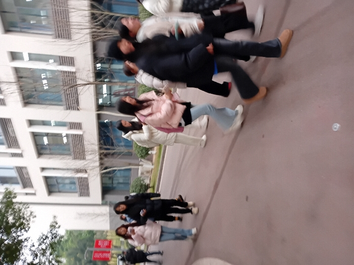 A group of people are walking along a sidewalk in front of a multi-story building with many windows. The individuals are dressed in casual clothing including jackets and jeans, and appear to be students or young adults. The scene is captured at an angle, with the building positioned to the left and the people moving from bottom to top of the frame. The background includes trees and what appears to be a public sign. The image quality suggests it might be a quick snapshot or a photo taken in motion.