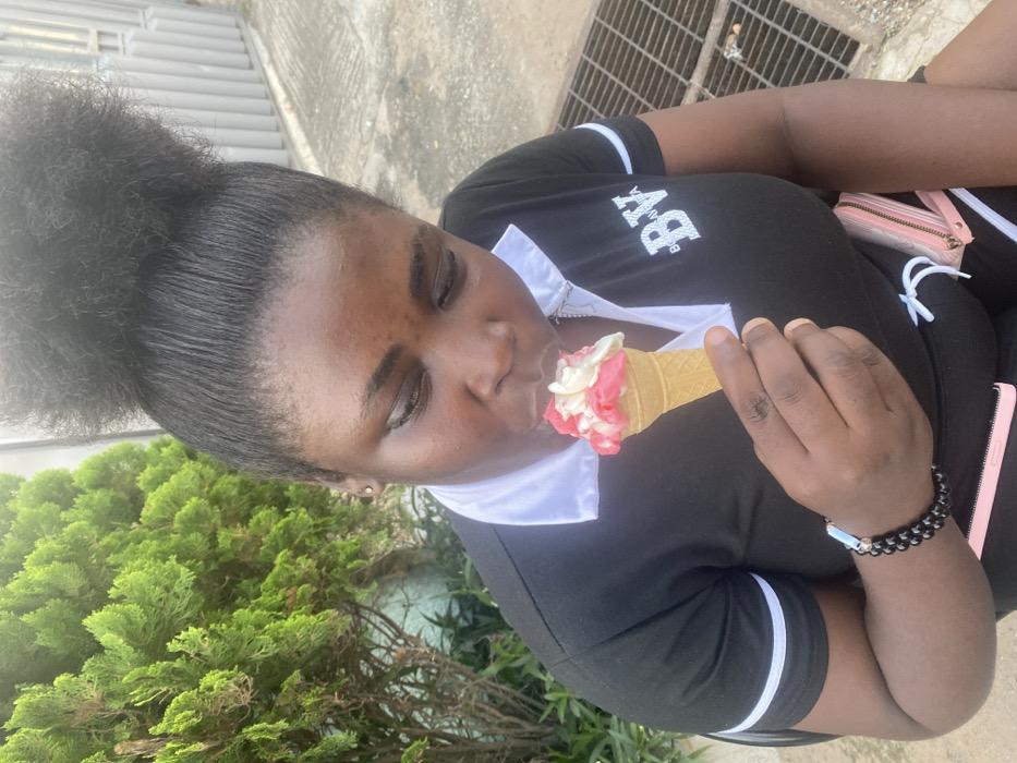 A dark-skinned female, appearing to be a young adult, is depicted outdoors, likely on a street or sidewalk in Accra, Ghana. She is focused on eating a multi-colored ice cream cone, composed of swirled white/cream and pink/red ice cream in a light brown waffle cone, held in her left hand. Her dark hair is styled in a high bun. She wears a black short-sleeved polo shirt with a white collar and white trim, featuring "BV" (and possibly "BONAVISTA") embroidered on the left chest. A black beaded bracelet with a silver-colored rectangular charm is on her left wrist. A light pink fanny pack or small bag is visible around her waist. To her left, dense green foliage is present. To her right, a metallic street grate is visible on light grey concrete pavement, with a lighter-colored building or fence structure in the background.
