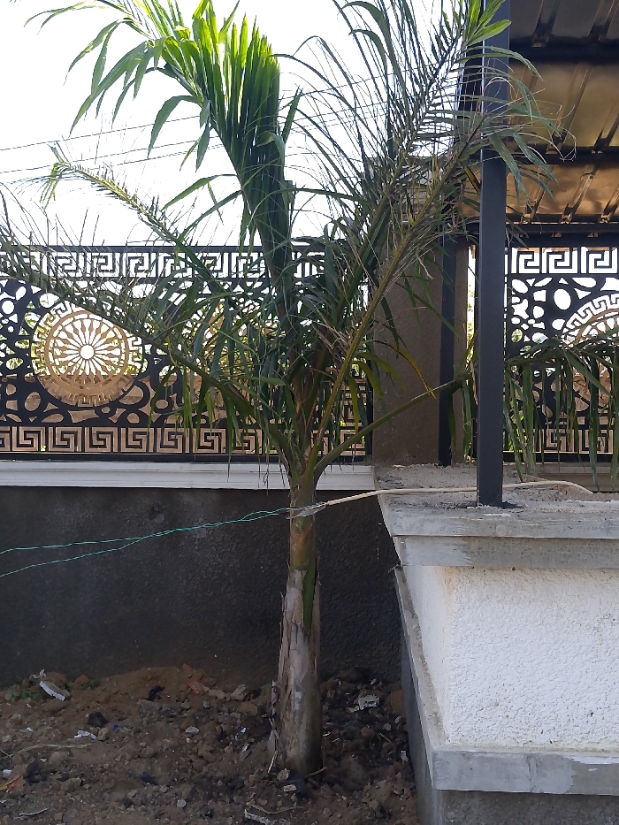 The scene depicts an outdoor area in Kwang, Nigeria, centered on a young palm tree. The tree features a light brown trunk, approximately 1.5 meters tall, with green and some partially dried fronds extending upwards and outwards. A thin green wire is loosely stretched horizontally across the lower trunk area. The immediate ground consists of exposed reddish-brown and dark earth containing scattered small debris. Behind the tree, a dark gray concrete wall is topped by a white concrete coping, which supports a black metal fence. This fence displays a geometric Greek key pattern integrated with circular medallions, some featuring a golden-colored spoked-wheel or sunburst design. To the right, a section of a textured white building wall or pillar with gray concrete trim is visible, from which a black square metal support post extends upwards. A dark, possibly metal, roof or awning structure is partially visible above the post. The background reveals a bright, hazy white sky. No persons or animals are present.