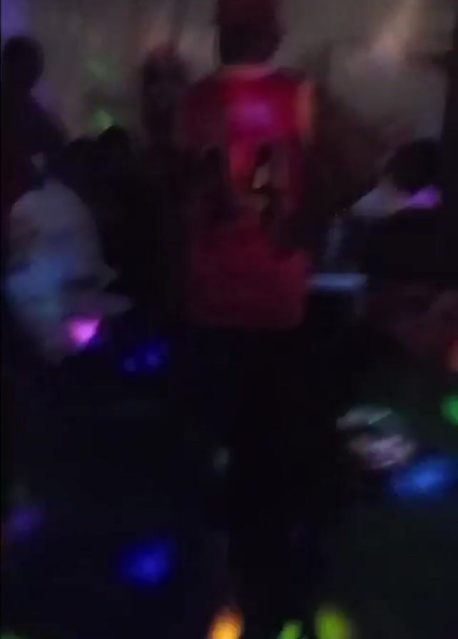 A dimly lit nightclub with a crowded dance floor pulsates with multicolored lights. A man wearing a red basketball jersey with the number 14 on the back stands amidst the crowd, partially obscuring a sign that reads "Imperial B". Other people are seated at tables, illuminated by the colorful lights. One woman is looking at her phone. Beer bottles sit on the tables. The scene is lively and energetic.