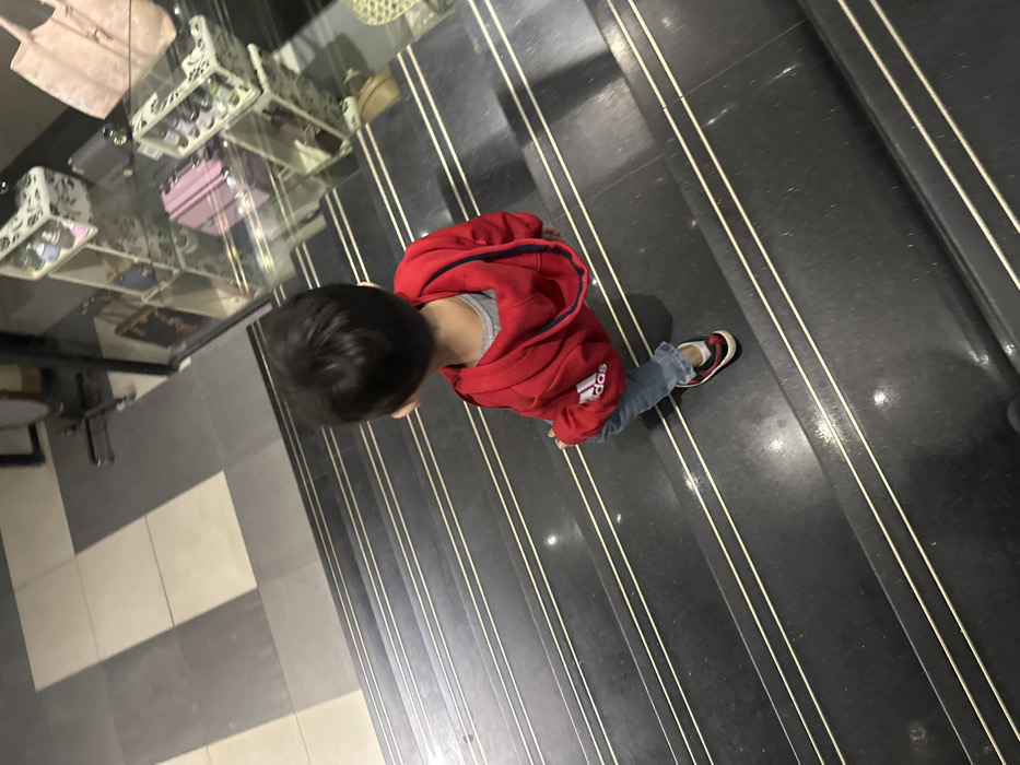 A child, viewed from behind and from an elevated perspective, is positioned on a flight of dark, reflective stairs, possibly descending or standing. The child wears a red hooded sweatshirt with a white "adidas" logo visible on the left sleeve, blue denim jeans, and black sneakers with red and white accents. The stairs feature multiple thin, light-colored parallel lines running horizontally across each step. At the bottom of the stairs, a floor comprised of alternating dark and light square tiles is visible. To the right of the stairs, a retail or display area is visible through what appears to be a glass barrier, showcasing modular display shelves containing various objects, including a prominent light pink handbag and smaller items. A dark, possibly metallic, stand or object is present on the tiled floor to the left. The scene is located in Barza Municipality, Syria.