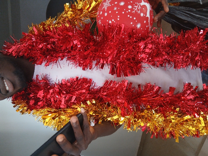 An adult male, exhibiting dark skin and a short beard, is depicted from the mid-chest upwards, smiling. The subject wears a white t-shirt and is adorned with multiple strands of red and gold metallic tinsel garland around his neck and upper torso. His left hand secures a black smartphone, angled slightly downwards. His right hand holds a spherical red balloon, featuring white snowflake and reindeer imagery, positioned above a partially visible black plastic bag. The background consists of a plain, light-colored wall, indicating an indoor environment. Location: Unknown, Unknown.