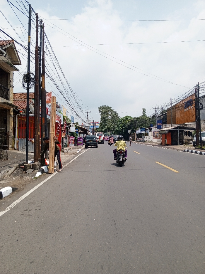The image depicts a daytime street scene in Multhan, India, under an overcast sky. The view is oriented down a multi-lane asphalt road with a solid white line bordering the left sidewalk and segmented yellow lines marking the center. On the left sidewalk, two adult males are positioned near a cluster of four wooden utility poles. One man, wearing a dark top and pants, is holding a bundle of light-colored, vertically oriented poles, possibly bamboo, against one of the utility poles. Another man, wearing a red shirt and dark pants, is assisting nearby. Overhead, a dense network of black electrical wires spans across the street from the utility poles. To the left of the road, various multi-story buildings with commercial fronts, including one with an orange tiled roof and red-barred ground-floor openings, line the street. On the right side of the road, more commercial buildings are visible, including one with a reddish-brown brick facade featuring a partial "JUMBO SHOP" sign. Traffic is present on the road. A person wearing a yellow top and dark pants is riding a dark-colored motorcycle away from the viewer in the right lane. Further down the road, a dark SUV, a white bus, additional cars, and other motorcycles are visible in various lanes. Pedestrians can be seen walking on the far right side of the street. Trees and more distant buildings are visible towards the horizon, framed by the overcast sky.