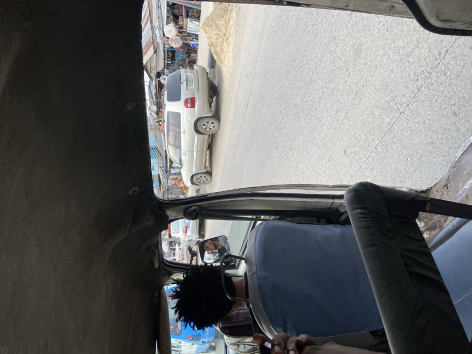 The image depicts a street scene in Sangotedo, Nigeria, viewed from inside a vehicle. In the immediate foreground, a dark, worn headliner of the vehicle's interior is visible. The back of a person's head with dark, curly hair is seen in the driver's seat, or front passenger seat, of the vehicle. A side-view mirror reflects the face of a man with a beard looking forward. Part of a light blue seatback is visible below the head. A hand holding a dark object is partially visible on the left. The interior door frame shows exposed, possibly rusted, metal. Through the open vehicle window, a light gray asphalt road occupies the center and lower right of the frame. On the right side of the road, a silver Toyota Highlander SUV is parked, partially over a curb, adjacent to a pile of light-colored sand. In the background, a bustling street environment is present. To the far left, a blue and white bus is visible in traffic. Further down the road, another silver sedan, potentially a Mitsubishi, is visible. Along the right side of the road behind the SUV, a series of market stalls with corrugated metal roofs and various goods displayed, including electric fans and gas cylinders, line the street. A blue building or structure is visible in the distance on the left side of the street. The sky appears overcast or hazy.