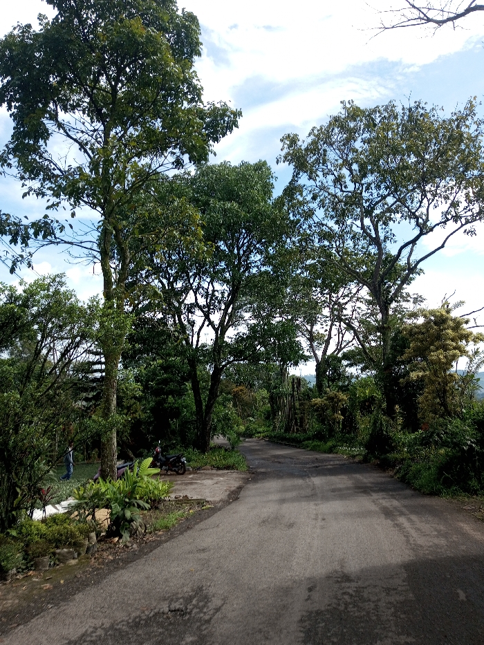 The scene depicts a narrow, paved road in Ariyalai, Sri Lanka, extending from the foreground into the distance with a slight curve to the right. The road surface is dark gray asphalt, showing signs of wear with some lighter patches and minor irregularities. Dense green foliage, primarily from large broadleaf trees with thick trunks and extensive canopies, flanks both sides of the road, creating a tunnel-like effect and partially obscuring the blue sky with scattered white clouds visible overhead. On the left side of the road, a dark-colored motorcycle or scooter is parked off the asphalt on a dirt patch beneath a tree, facing away from the viewer. Further to the left, partially obscured by foliage and a tree, a single individual is standing on a landscaped area with a white-edged border and green plants. The person appears to be wearing light-colored clothing, possibly a blue top and white lower garment. In the mid-ground, within the dense vegetation on the right, several dark, vertical structures, possibly wooden poles or supports, are discernible.