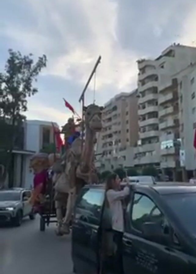 large, constructed camel being paraded through city streets, accompanied by music. The camel, appearing to be a light tan color, is mounted on a cart pulled by unknown means. The cart also carries people, one of whom is wearing a green cap. A Moroccan flag is visible on the cart. The streets are lined with buildings, and several cars are stopped, presumably to watch the procession. One woman is standing near the open door of a black van, apparently taking pictures or videos of the camel and its entourage. The sky is cloudy and overcast.