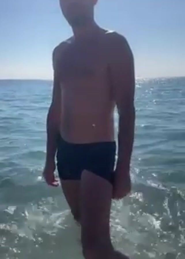 A man with pink hair and black swimming trunks stands in the ocean on a sunny day. The ocean is a bright turquoise color and the sky is a clear blue. The waves are gently lapping around the man's legs. He looks toward the camera, then raises one hand to his mouth and back down again.